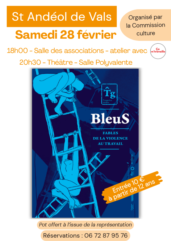 - 20h30 – Spectacle « BleuS » par la compagnie Tungstène théâtre, est une création visuelle, sonore et chorégraphique qui explore la violence au travail. À travers des scènes burlesques, poétiques ou intimes, la compagnie interroge : et si le problème n’était pas le travail lui-même, mais les conditions dans lesquelles on nous demande de le faire ? Lieu : Salle polyvalente – Tarif : 10 € (à partir de 12 ans).